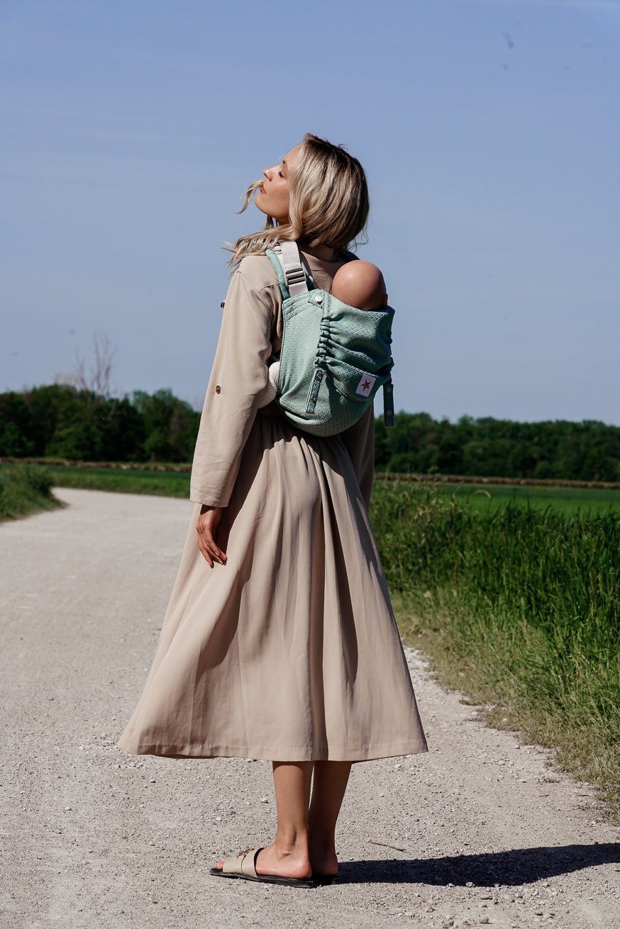 Avec notre porte-bébé KOKADI Onbu original, vous pouvez transporter votre bébé de l'âge tardif jusqu'à la fin de la période de portage facilement, rapidement et confortablement comme avec un sac à dos sur le dos - aucun nouage fastidieux et fastidieux n'est nécessaire !