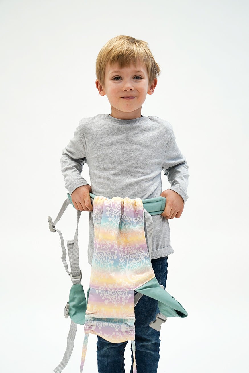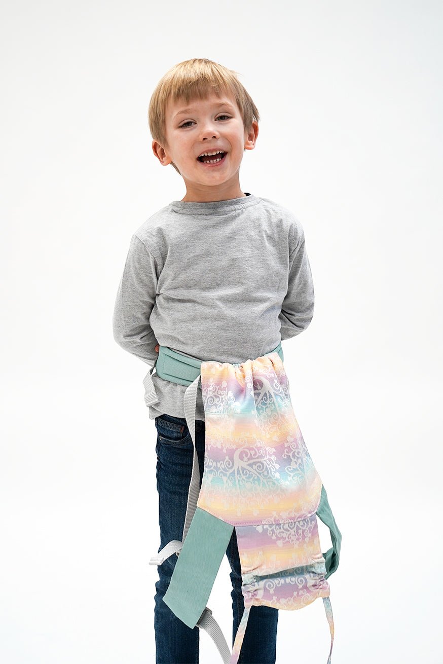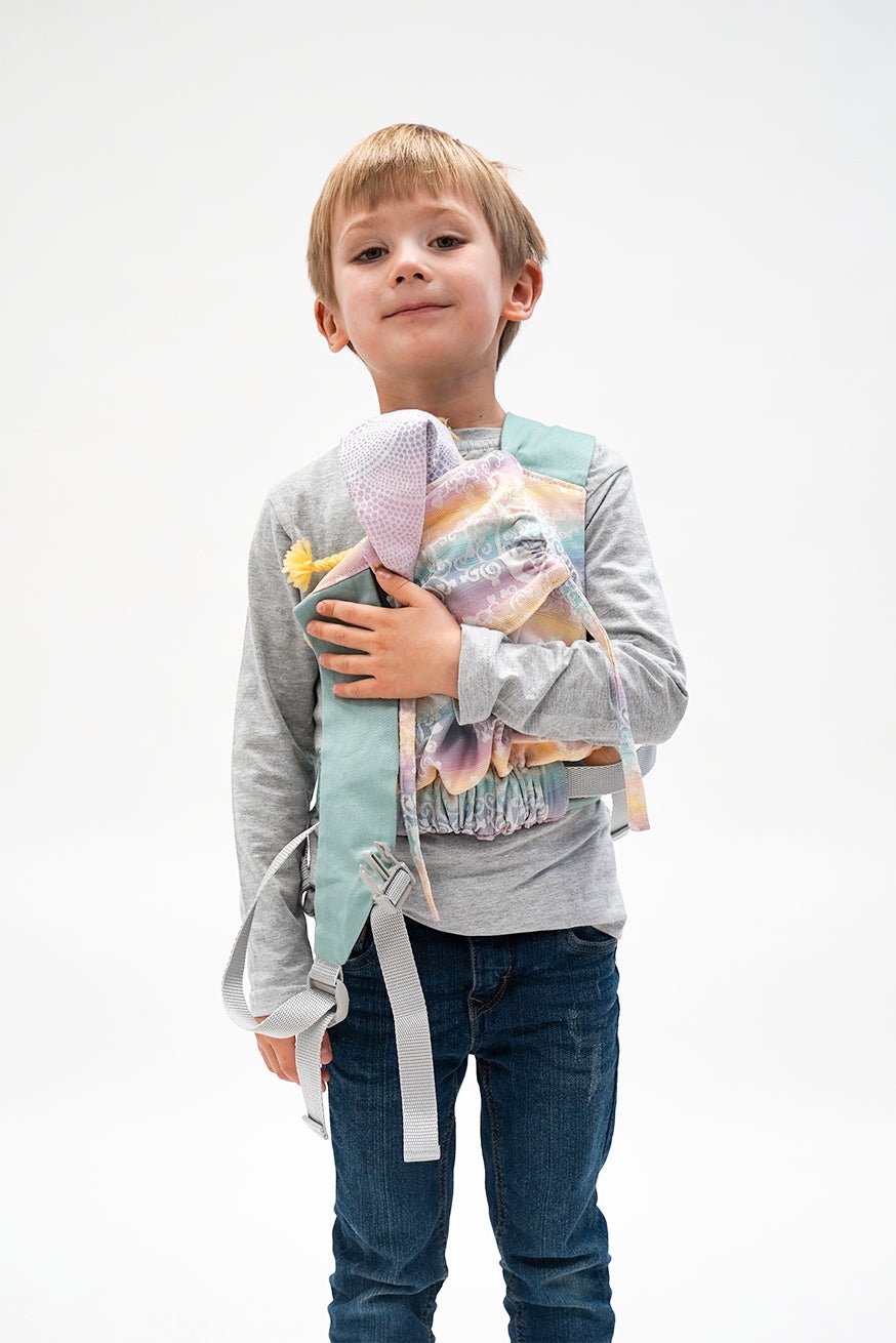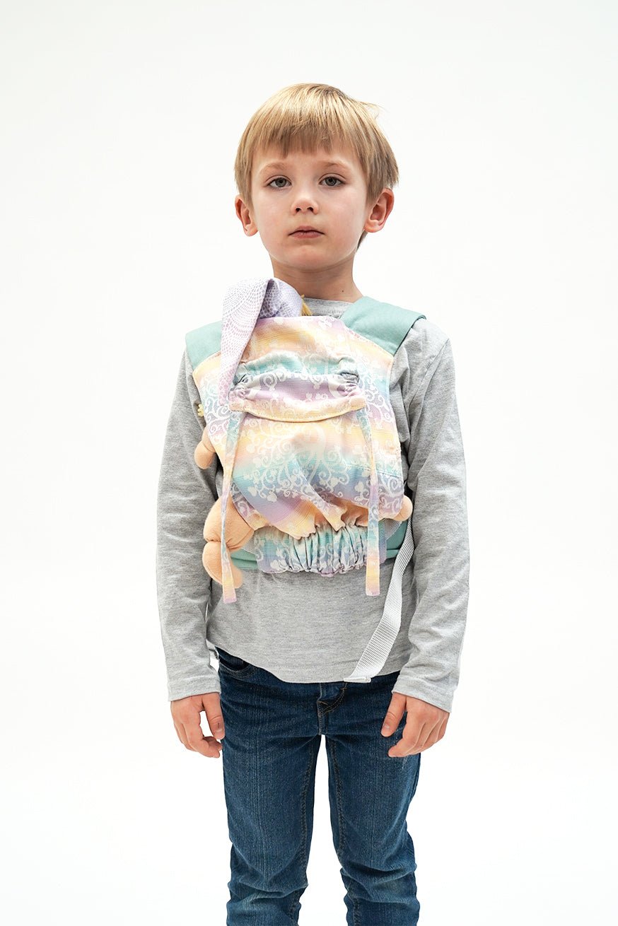 Comme tous nos produits de port, le panneau arrière est fait de transporteur tissé. La ceinture de hanche du mini flip est comme le Flip le gros réglable. La largeur du pont peut être réglée de manière glaciale avec le mini flip. La largeur du pont peut être réglée en continu et le jeu de l'enfant avec le mini flip. Les poupées et les jouets câlins jusqu'à 45 cm KOKADI Mini flip.