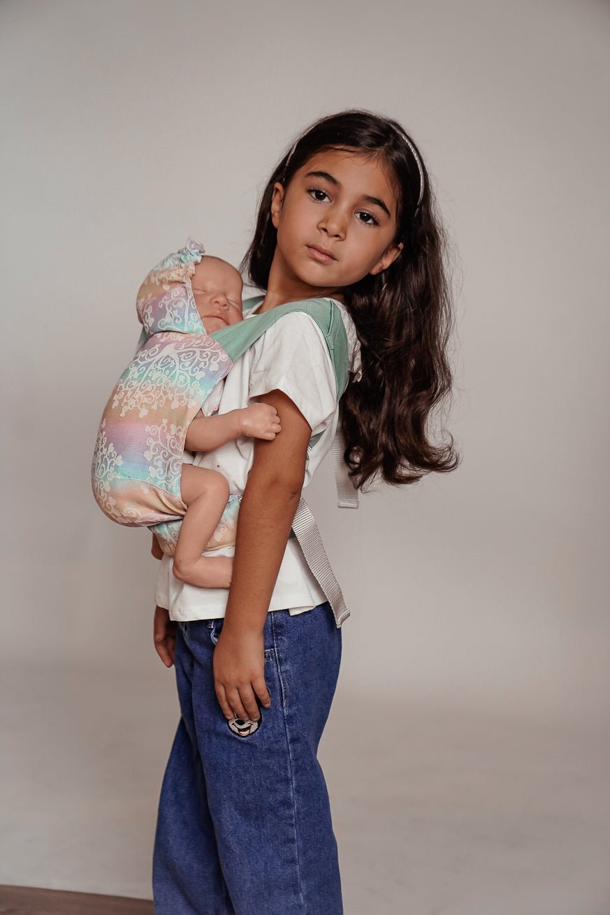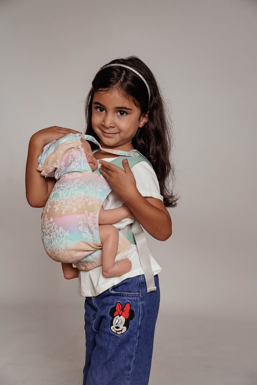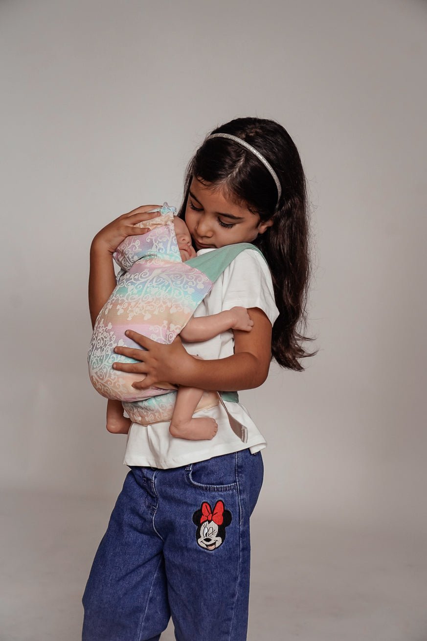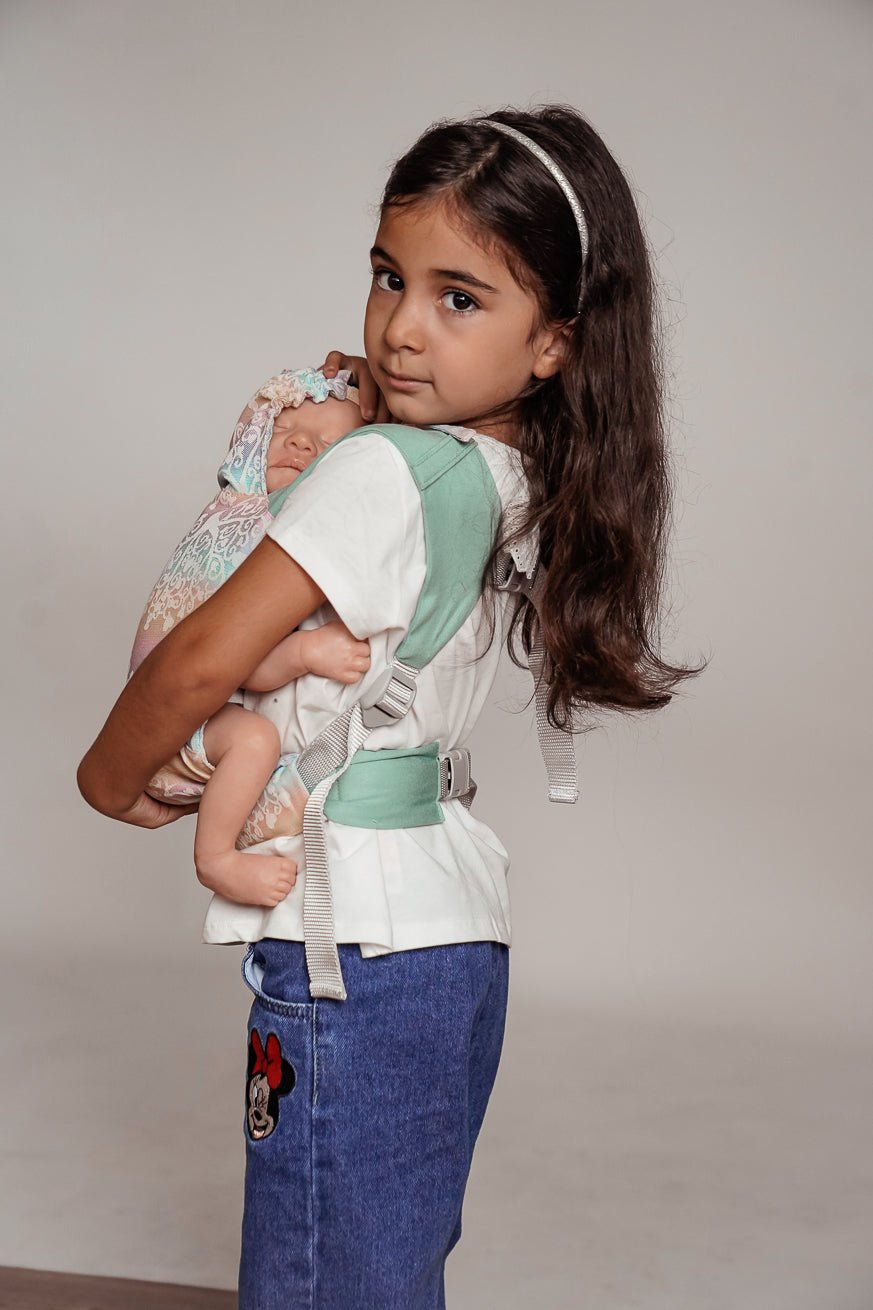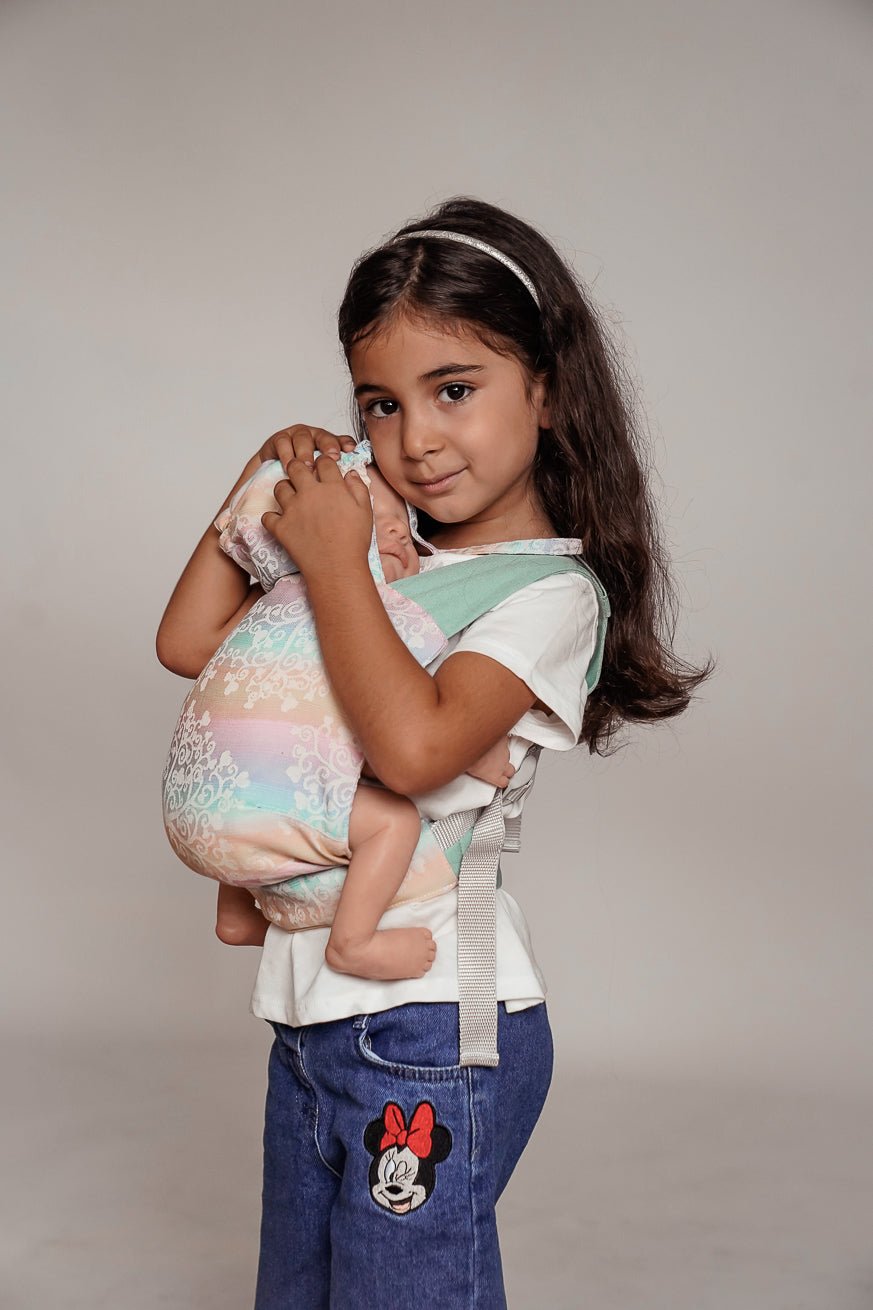 Comme tous nos produits de port, le panneau arrière est fait de transporteur tissé. La ceinture de hanche du mini flip est comme le Flip le gros réglable. La largeur du pont peut être réglée de manière glaciale avec le mini flip. La largeur du pont peut être réglée en continu et le jeu de l'enfant avec le mini flip. Les poupées et les jouets câlins jusqu'à 45 cm KOKADI Mini flip.