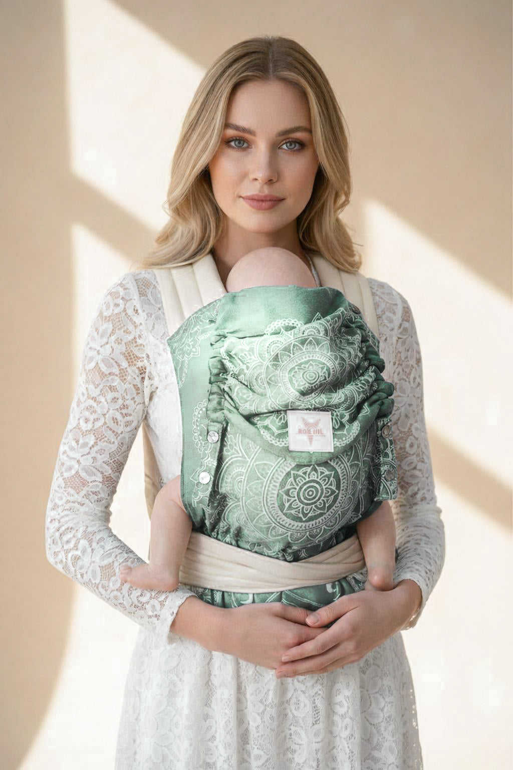 Die Schulterträger beim TaiTai sind gepolstert (nicht aus Tragetuchstoff) – genau richtig für alle, die es bequem lieben und trotzdem einen eleganten Look möchten. TaiTai in Mandala Salvia Mats ist nicht nur Tragen – es ist gemeinsames Ankommen.