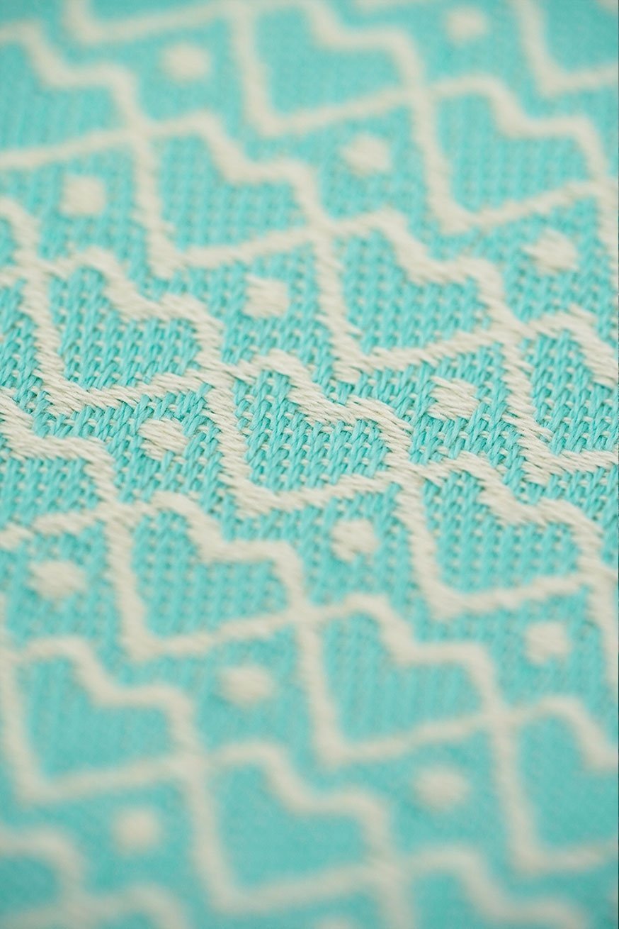 Fabriqué à partir de coton 100% biologique de haute qualité, le motif cœur a été tissé directement dans le tissu et donne au tissu une structure unique. Avec un poids de surface de seulement 200 g/m², le tissu de l'écharpe est incroyablement léger et en même temps si stable que les nouveau-nés et les bébés plus grands peuvent y être transportés.