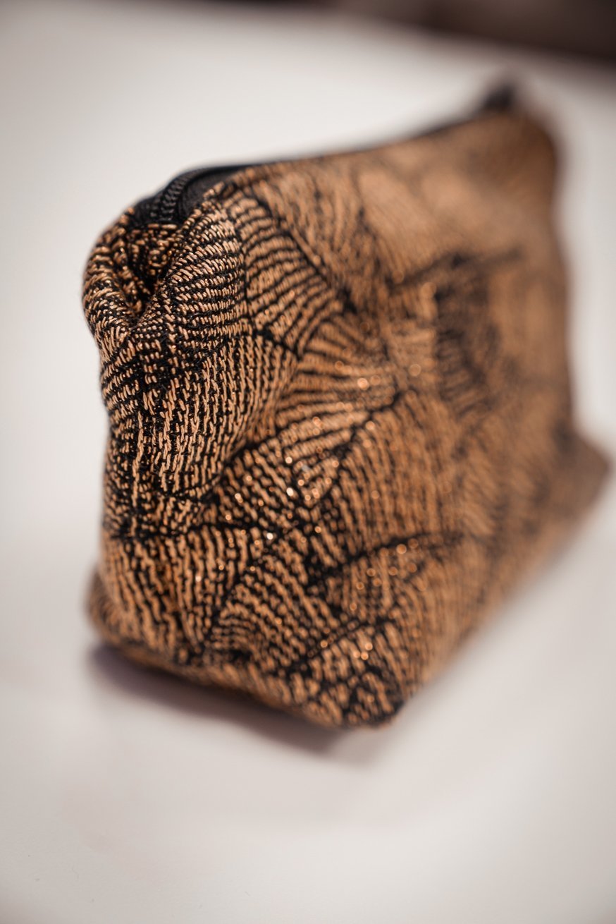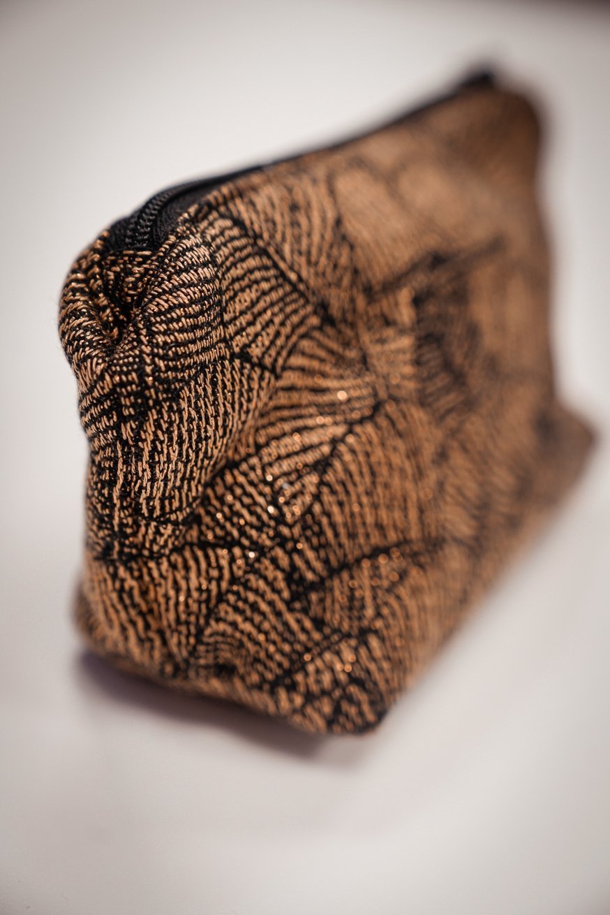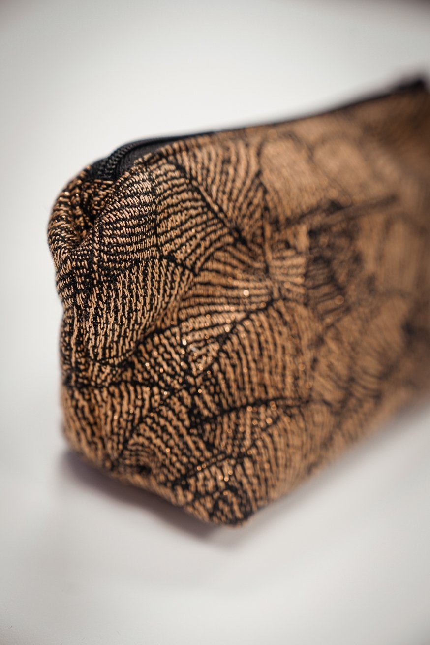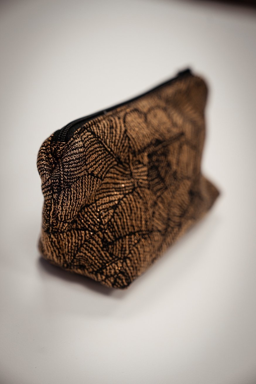 Le KOKADI Trousse à maquillage – bien sûr en tissu Sling. Des plumes enchanteresses, sur un fond doré magique. Notre design Leaves Lynne captive vraiment tout le monde.